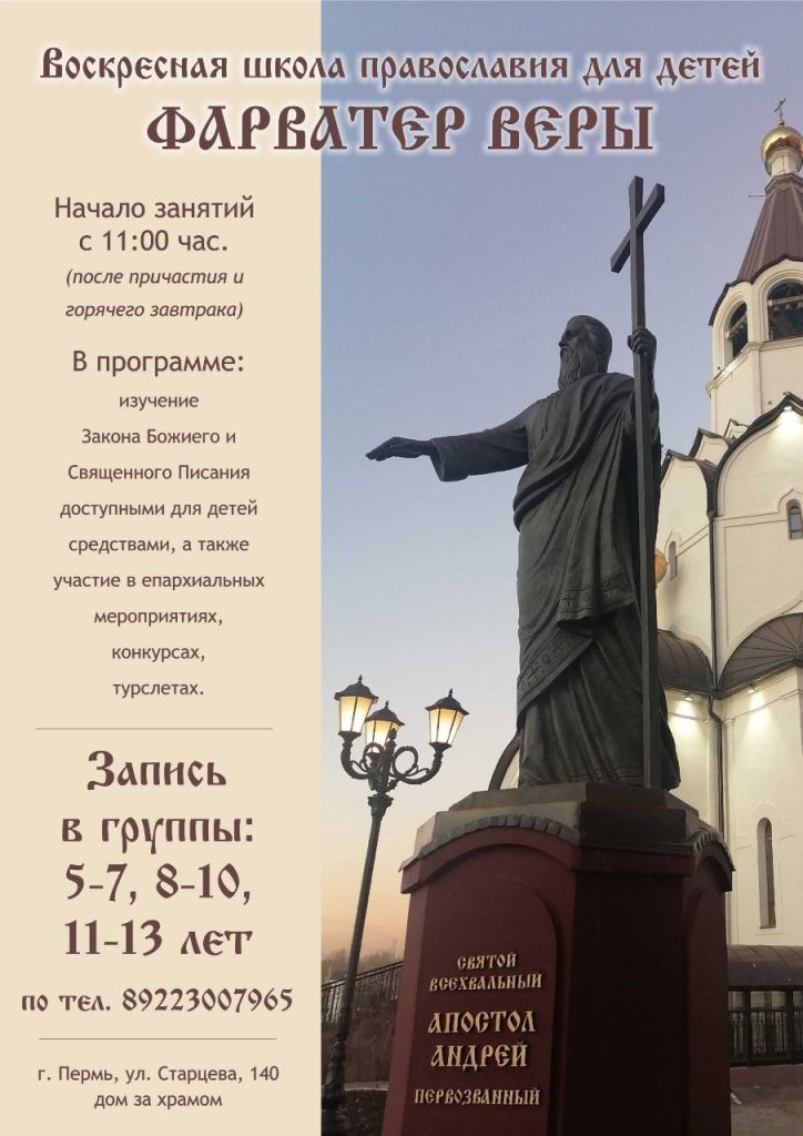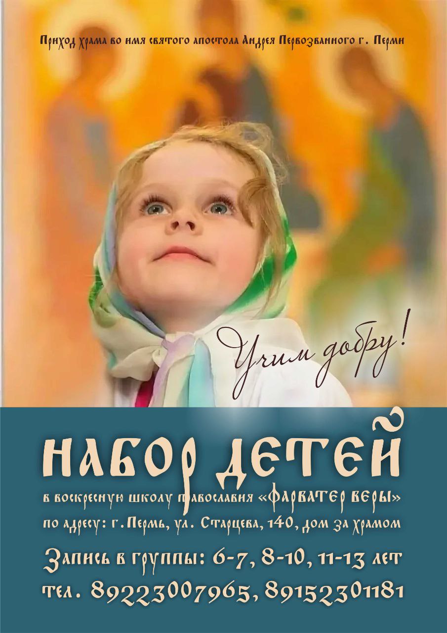 Если вы хотите, чтобы ваш ребенок начал или продолжил изучать Закон Божий вместе с другими девочками и мальчиками под руководством молодого, но опытного наставника Ангелины Алексеевны, то ждем ребят по воскресеньям в трапезной церковно-причтового дома за Андреевским храмом (Пермь, ул. Старцева, 140).